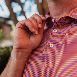 Introducing The Graduate Stripe Performance Polo, designed for those who demand both style and performance. Featuring five bold color stripes, this polo delivers a sharp, masculine look that’s perfect for any occasion—whether you're out for a weekend outing, at a sports event, or enjoying a casual day with friends.